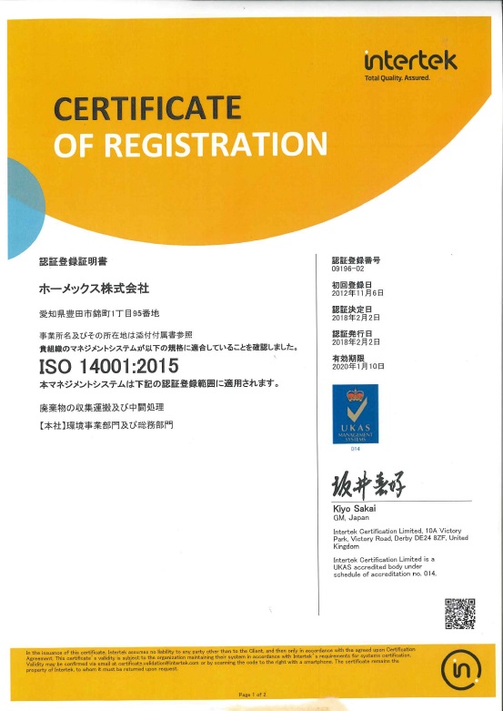 矢並リサイクルセンターの廃棄物業務を主体に取得しているISO14001です。