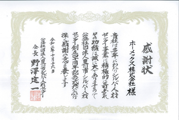 長年の取り引きへ感謝のとして会長感謝状受賞者として表彰されることなり、10月16日の記念式典で授与式が行われる予定でしたが、