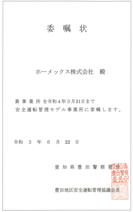 2021年4月1日~2022年3月31日までの1年間、安全運転モデル事業所にホーメックスが認定されました。