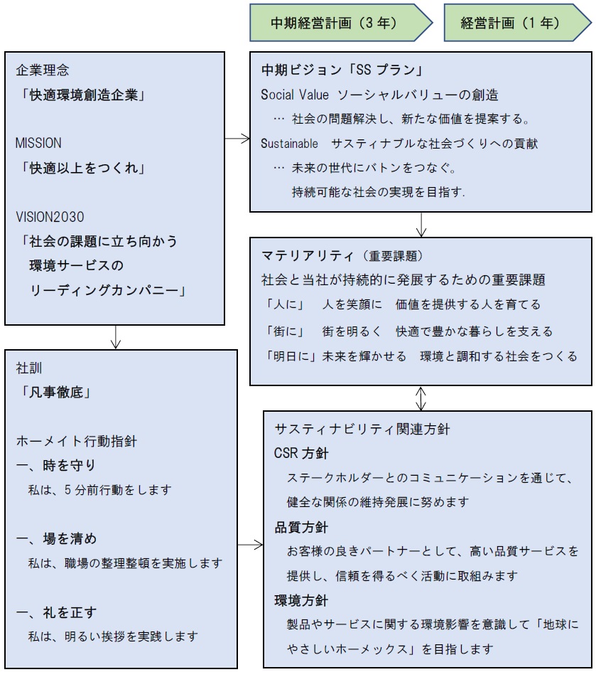 ホーメックスのサスティナビリティの考え方は、経営理念、MISSION、VISION2030、そして中期ビジョン「SSプラン」として明示しています。