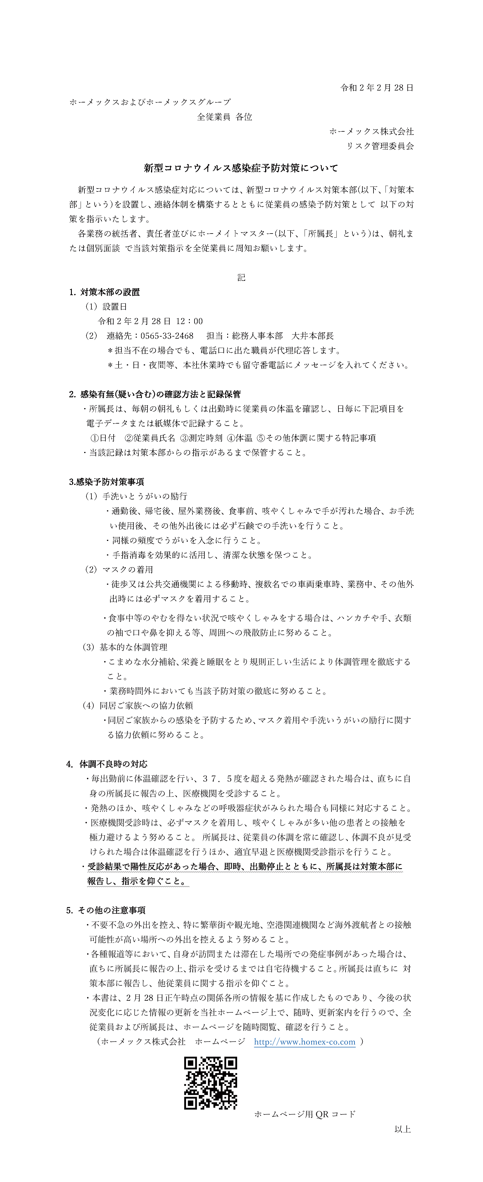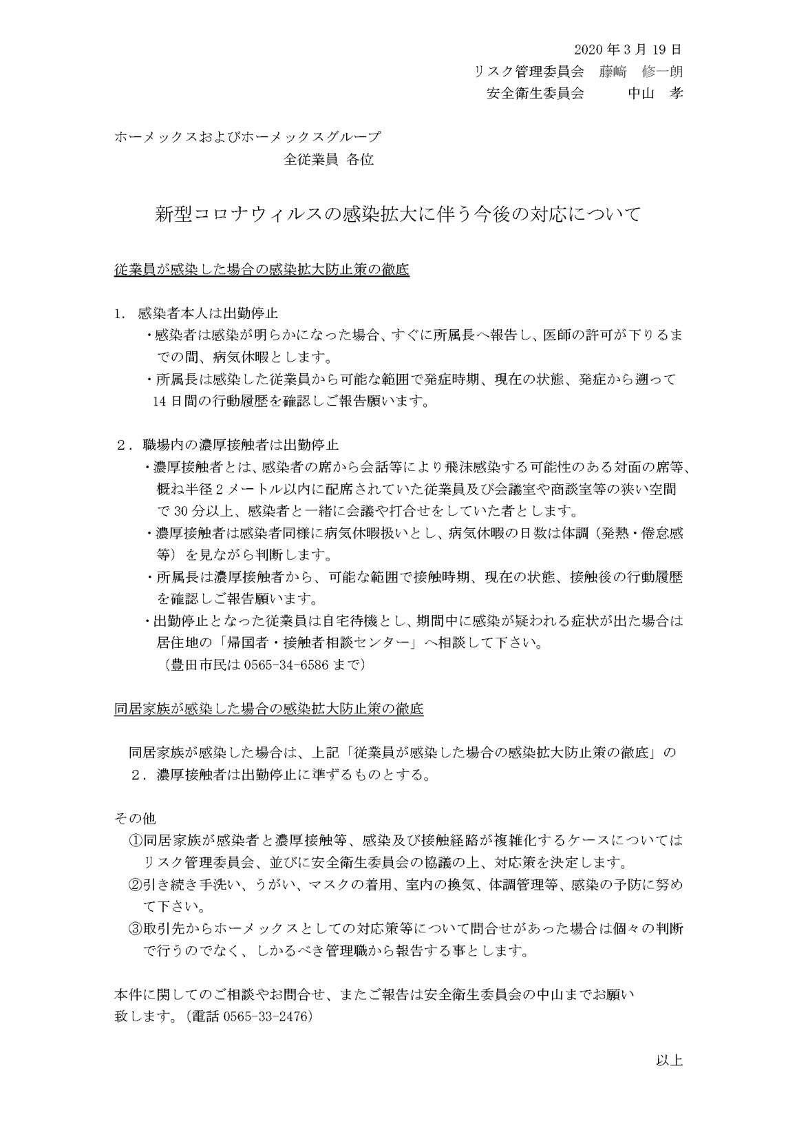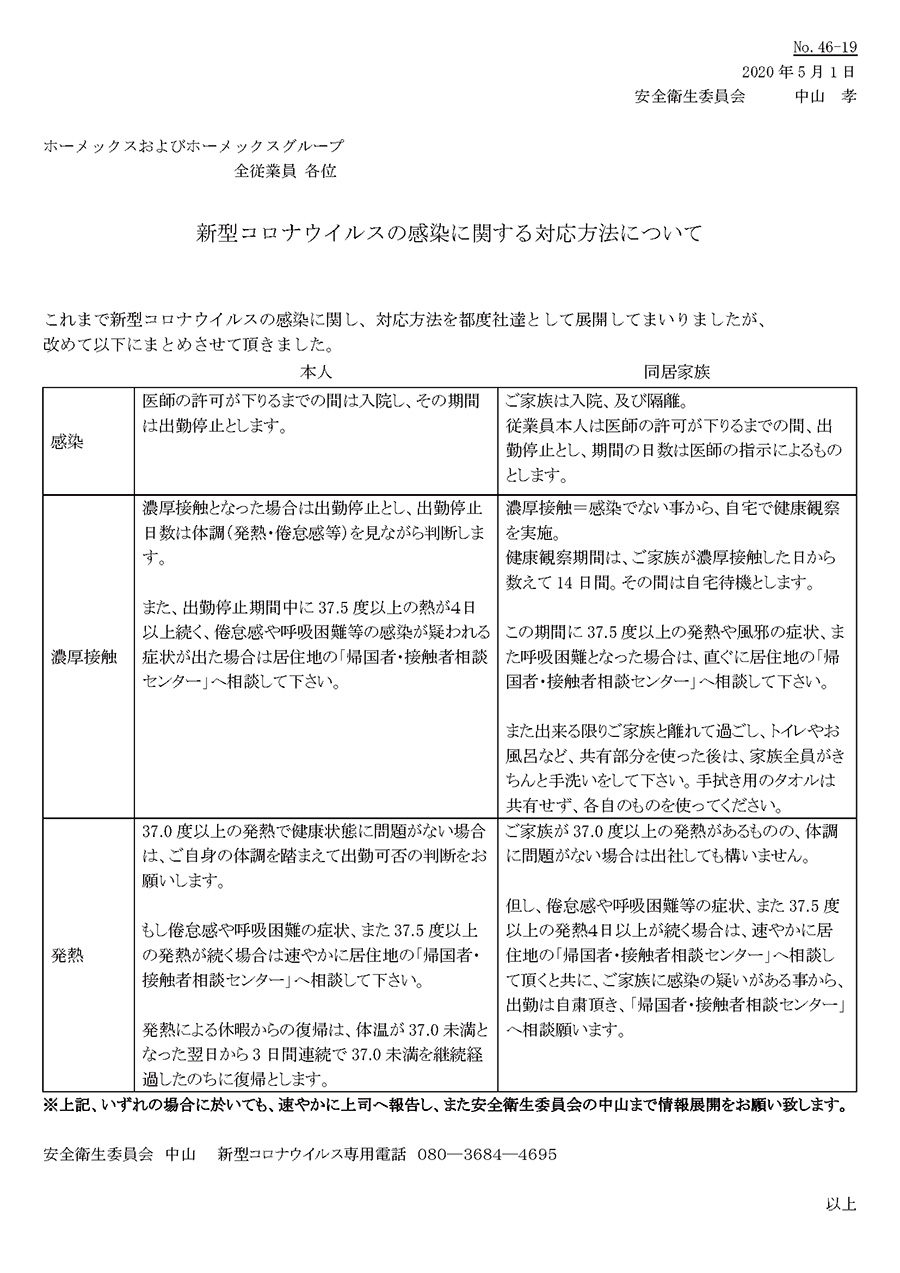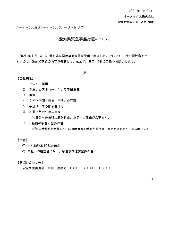 当社及び当社グループ会社の新型コロナウィルス感染症予防対策について(当社従業員向け)