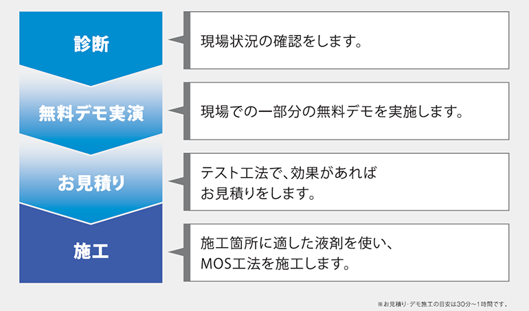 MOS工法の特殊洗浄剤は、たとえば防カビ剤なら野菜の洗浄に使われるものが主成分となっているなど安全性が高く、またシンナーやトルエンなどを溶剤として使用しないため、洗浄排水が環境に負荷をかけることもありません。