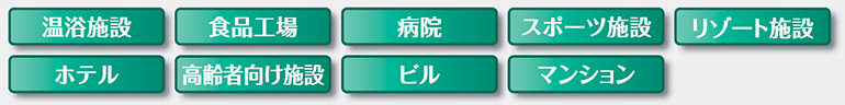 温浴施設、食品工場、病院、スポーツ施設をはじめ、あらゆる建物、施設に。
