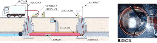 SZ工法は、マンホールを利用して下水道管内にSZライナーを引込み、空気と蒸気とでライナーを拡張・加熱して既設管の中に自立管を形成する工法です。