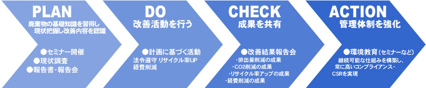 「法令遵守」「リサイクル率UP」「経費削減」の目標へ向けて、改善活動を進めます。
