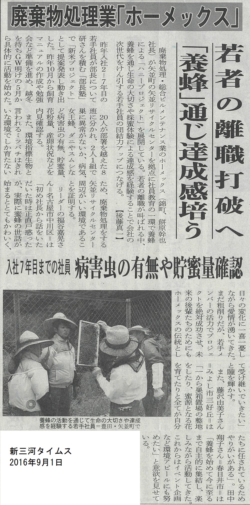 - メディア情報 新三河タイムス掲載・「若者の離職打破へ「養蜂」通じ達成感培う」