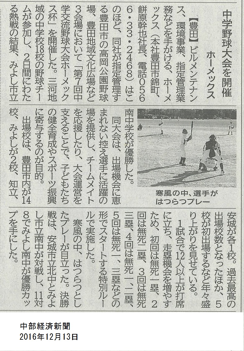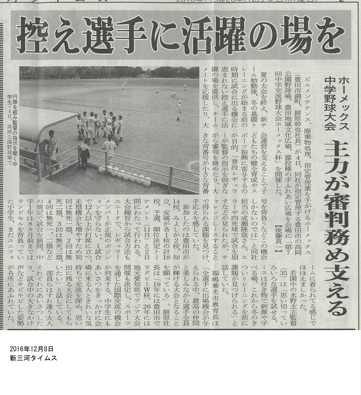 - メディア情報 新三河タイムス・「控え選手に活躍の場を ホーメックス中学野球大会」