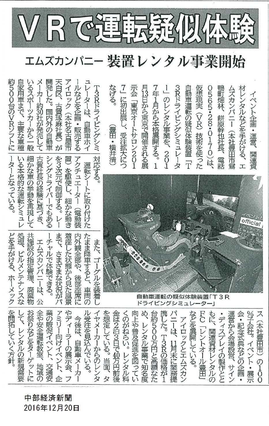 - メディア情報 中部経済新聞・「VRで運転疑似体験」