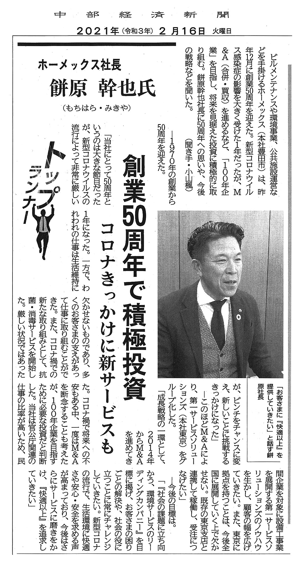 - メディア情報 中部経済新聞/創業50周年で積極投資