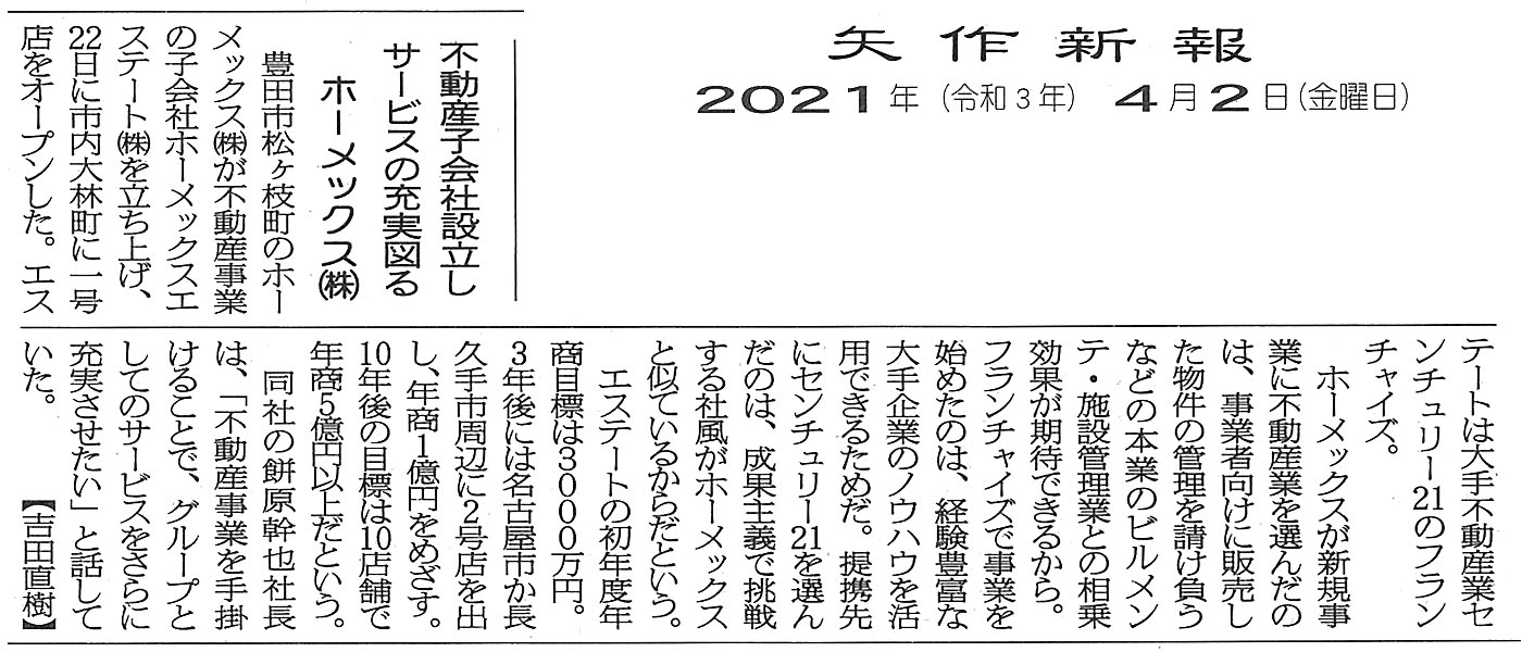 - メディア情報 矢作新報/不動産子会社設立しサービスの充実図る